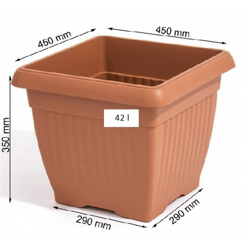 A nagyméretű műanyag terrakotta virágtartó egy négyzet alakú kialak?tással rendelkezik, és 42 literes térfogatot kínál. Alkalmas otthonra, de erkélyre, teraszra vagy kertbe is.Méretek: 450x450x350mm