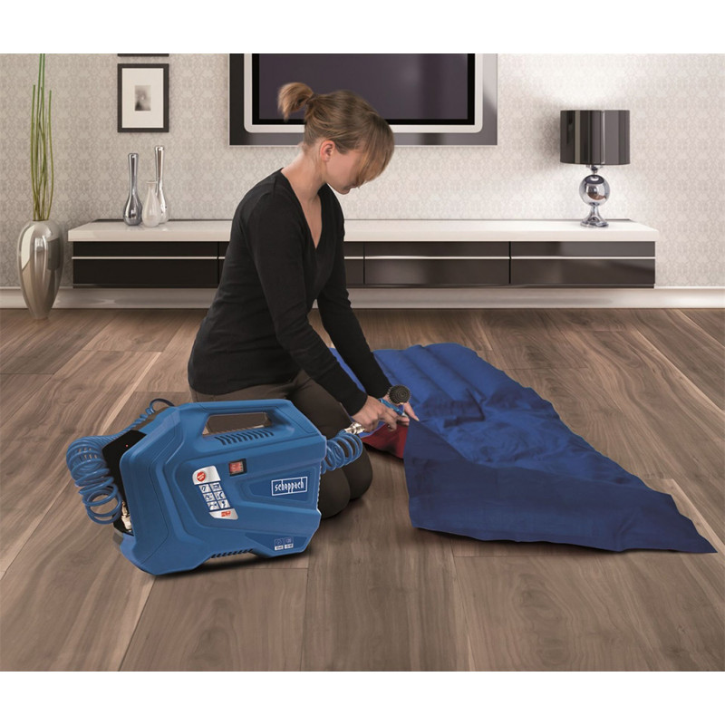 A Scheppach AIR FORCE 3 kompresszor egy nagyon praktikus, helytakarékos, könnyű, erős és sok funkcióval ellátott gép, amely kiváló segítség minden háztartásban, hétvégi házban, lakókocsiban vagy hajón. A nagyon sok, különböző csatlakozónak köszönhetően, könnyedén megbírkózik a motor, autó és kerekpár gumijával, a labdák, matracok, csónakok stb. felfújásával is. Az összes tartozék, a hálozati kábellel, a minőségi, 3 m hosszú nagynyomású tömlővel, a manométeres pisztollyal és a kilenc különböző csatlakozóval együtt, nagyon ügyesen van elhelyezve a kompresszor belsejében, így semmi sem vész el. A kényelmes markolat megkönnyíti a gép hordozhatóságát. A kompresszor a legmodernebb, olajmentes tehnológiával készült motorral van felszerelve. Az olajszint ellenőrzése, utánpótlása vagy cseréje teljesen szükségtelen, mert a kompresszor így is mindig készen áll a munkára. Mérete és összesen 5,5 kg súlya miatt használata ideális kempingezéshez vagy más szabadtéri tevékenységekhez.Műszaki adatok:
