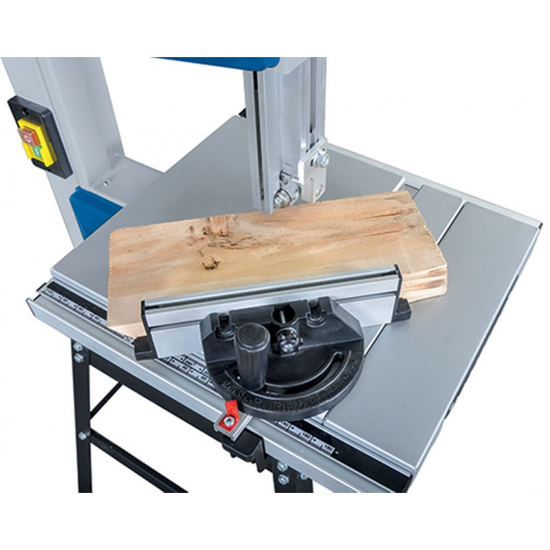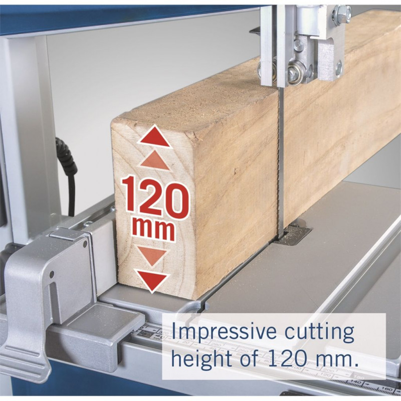 között megtalálható a rögzíthető párhuzamvezető és a pontos szögvonalzó. A vázszerkezet további részei teljes mértékben fémből készültek. A szalagfűrész nagy, 120 mm-es vágómagassággal rendelkezik, és a párhuzamvezetőknek köszönhetően, melyek nem engedik a fűrészlap elmozdulását, nagyon pontos vágásokat lehet elvégezni vele. A dönthető oldalfalnak köszönhetően a fűrészszalag cseréje is nagyon egyszerű. A talapzati furatok lehetővé teszik a gép