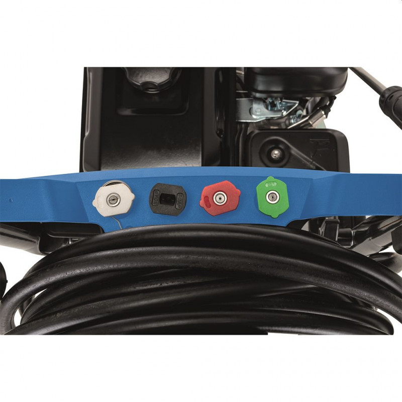 Kényelmi elemei a nagyméretű kerekek, a benzinmotornak köszönhető függetlenség az elektromos forrástól, 9,2 m hosszú, kiváló minőségű magasnyomású tömlő tartóval, tárolóhely 4 különböző fúvóka számára, tárolóhely nyomópisztolynak.