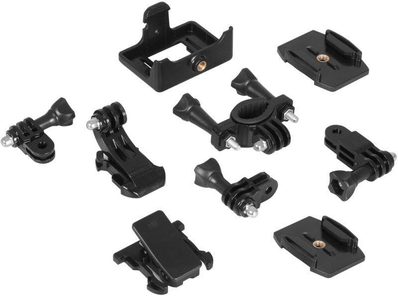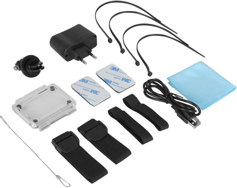 Vízálló tok, sisakrögzítő készlet, vízálló tok nélkül rögzítő készlet, szelfibot- vagy állványrögzítő készlet, csipesz a ruhához rögzítéshez, a kormányra vagy rúdra rögzítő készlet, összehúzó szalagok, +M öntapadó szalagok, acélhuzal, USB-s adatkábel, USB töltő, útmutató, rongy