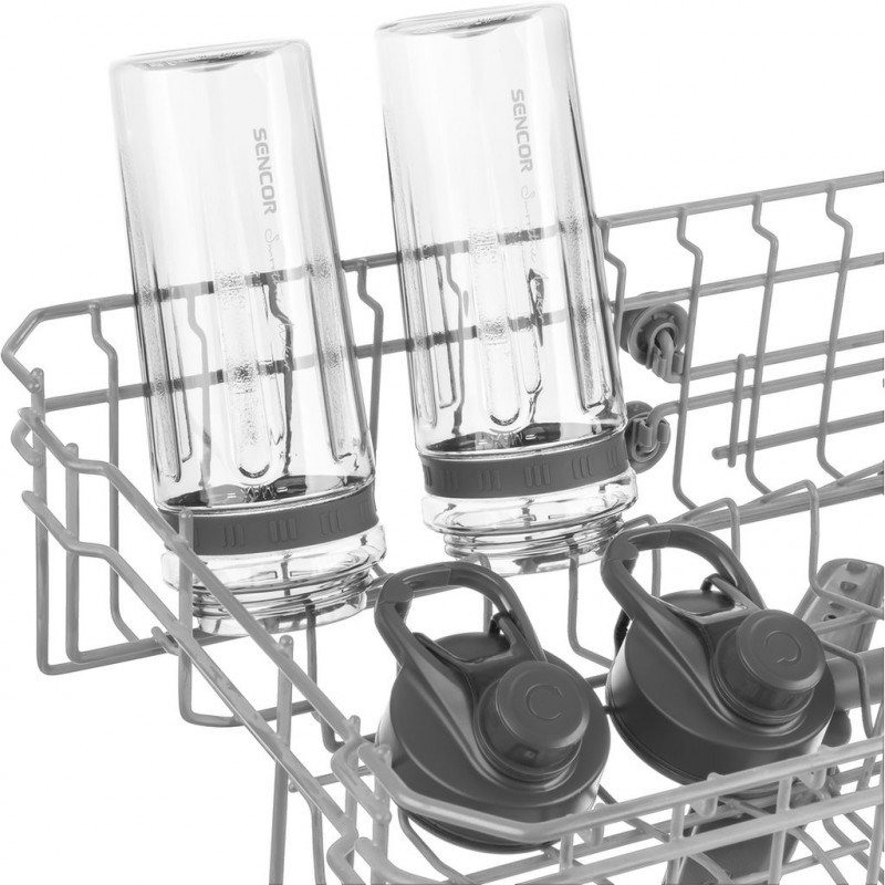 SENCOR SBL 7078BK smoothie mixer 41007921A Sencor SBL 7078BK segítségével frissen készíthet, különböző alapanyagból összeállított vitaminokban gazdag italt. A smoothie mixer zöldség vagy gyümölcsitalok, tejes koktélok, levesek, salsa szószok vagy bébiételek készítésére is kiválóan alkalmas. A hatékony működést az 800 W teljesítményű motor, a 6 nemesacélból készült minőségi kések garantálják. A csomag tartalmaz két 0,6 literes űrtartalmú Tritan-ból készült BPA mentes Sport palackot. A palackok könnyen zárhatók, a fedélen kialakításra került egy ivónyílás. A megbízható zárórendszernek köszönhetően nem kell tartani attól, hogy a pohár tartalma kiömlik. A poharak, a fedelek és a kések is mosogatógépben moshatók.