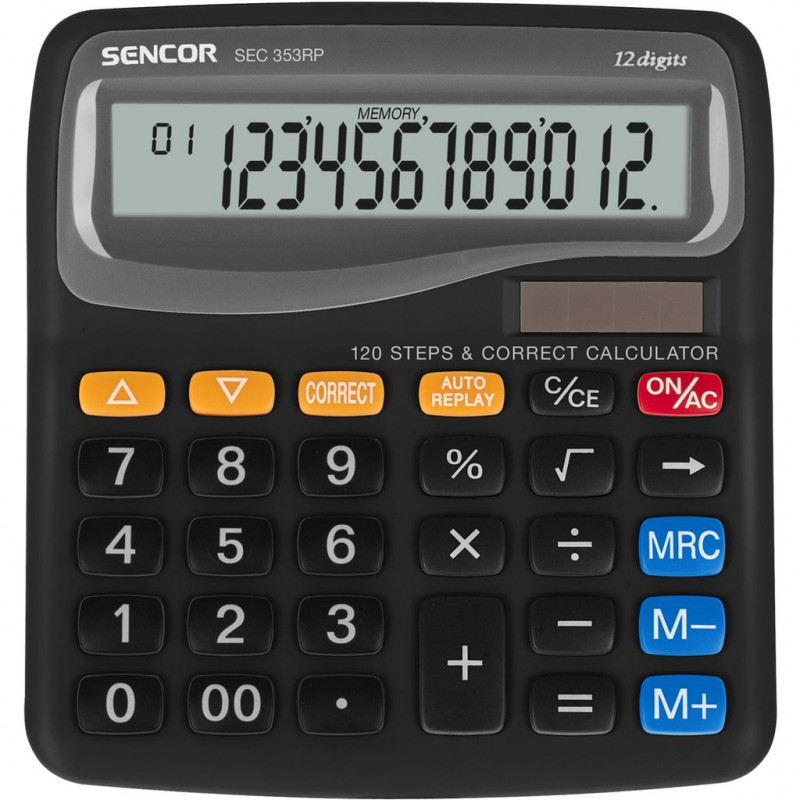 A Sencor SEC 353RP praktikus asztali számológép univerzális segédeszközként használható. Fő előnye a 12 számjegyű LCD kijelző, amely lehetővé teszi a kényelmes munkát és a számjegyek jó láthatóságát. A számológép változó jelekkel (+/-), négyzetgyök számítási, ÁFA számítási lehetőséggel és memóriával egy szám megjegyzésére és egyéb hasznos funkciókkal rendelkezik. A kettős áramellátó rendszer (napelem és akkumulátor) biztosítja a megbízhatóságot és a hosszú élettartamot.Jellemzők: