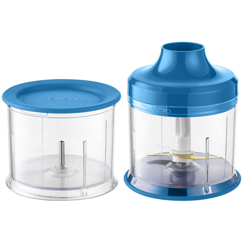 SENCOR SHB 4462BL-EUE3 botmixer 41010388A Sencor SHB 4462BL-EUE3 botmixer krémlevesek, szószok, bébiételek gyors elkészítésében nyújthat Önnek segítséget. Az extra csendes 1000 W teljesítményű motor változtatható sebesség funkcióval lett ellátva. A 6 rozsdamentes Titánból készült aprító pengék pedig forró ételek készítése mellett jégzúzáshoz is alkalmasak. Az ergonomikusan kialakított markolat biztos és kényelmes fogást biztosít. Az 700 ml-es keverőpohár segítségével nagy mennyiségű alapanyag is feldolgozható vagy akár mérőedényként is használható, továbbá megtalálható egy 500 ml kapacitású edény is, mely aprításra kiválóan alkalmazható.
