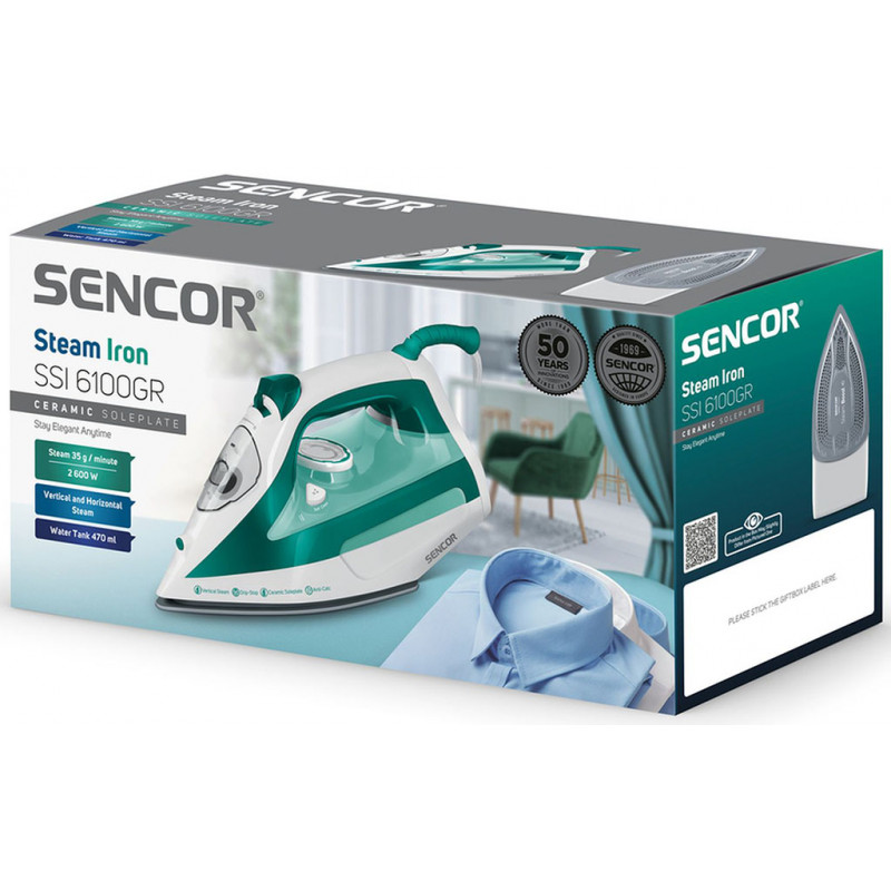 A Sencor SSI 6100GR vasaló kerámia gőzölő vasalófelülettel rendelkezik, mely könnyen használható bármilyen textílián. Az átlátszó víztartálynak köszönhetően bármikor nyomon követhető, mikor kell a gőzöléshez a vizet újra tölteni. A tartály könnyen, egyszerűen feltölthető. A fokozatmentes hőmérséklet és a gőzkiáramlás szabályozási lehetősége szintén megkönnyíti a vasalást, mint a beépített gomb által választható extra funkciók vízpermetezés, gőzlövet és a függőleges gőzölés vagy a locsoló. A megfelelő hőmérséklet beállítás mechanikusan történik és jelzőfény mutatja a hőmérséklet elérését. A hálózati kábel 360 °-ban elforgatható a vasalás közbeni elcsavarodás és az összegubancolódott vezeték elkerülése érdekében. Az öntisztító Self-cleaning rendszer megbízhatóan távolítja el az ásványi lerakódásokat, a cseppenés gátló Drip-Stop funkció megakadályozza a foltosodást a textilián.