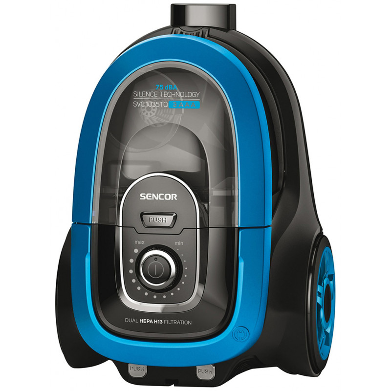 SENCOR SVC 1035TQ 3AAA porzsák nélküli porszívó 41011008A Sencor SVC 1035TQ porzsák nélküli praktikus és megbízható kialakítású porszívó.Cyclone Technology rendszerrel lett felszerelve, amely tökéletesen elválasztja a port a levegőtől. A felhasználóbarát tervezésnek köszönhetően a portartály és HEPA szűrő mosható, a szívóteljesítmény elektronikusan vezérelhető. A hatékony 750 W teljesítményű motor biztonsága érdekében egy hőbiztosítékot építettek be a motor túlmelegedésének megakadályozására. A gumírozott kerekek megkönnyítik a porszívó mozgatását a padlón.