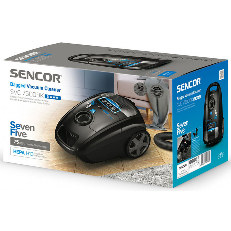 SENCOR SVC 7500BK porzsákos porszívó 41011006A Sencor SVC 7500BK porzsákos kialakítású praktikus, egyben megbízható szívóerejű porszívó. Ideális választás ház, lakás vagy iroda takarítására. Bármilyen felület porszívózásához tökéletes. A hatékony működést a 750 W teljesítményű ECO motor biztosítja, illetve a hosszú élettartam érdekében egy hőbiztosítékot építettek be a motor túlmelegedésének megakadályozására. A szívóerőt az elektromos szabályzó segítségével állíthatja be. A felhasználóbarát felhasználás érdekében beépítésre került egy porzsák telítettség jelző, az automatikus kábelbehúzás és a metál felületű XXL méretű teleszkópos cső is. A gumírozott kerekek megkönnyítik a porszívó mozgatását a padlón.