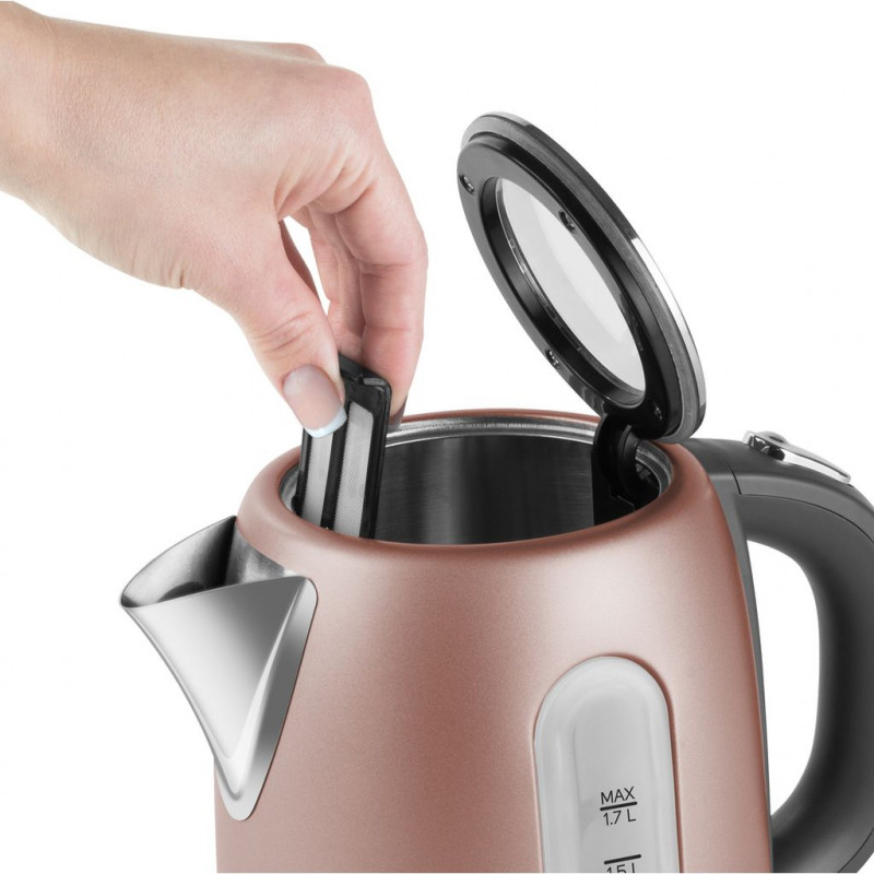 SENCOR SWK 1775RS vízforraló 41006463A Sencor SWK 1775RS egy nagy teljesítményű nemesacélból készült elektromos vízforraló 2150 watt maximális teljesítménnyel, mellyel időt és energiát takaríthat meg. Akár 1,7 liter vizet is képes egyszerre felforralni, így 6 vagy több fős háztartásokba megfelelő választás. A készülék használatát ergonomikusan kialakított fogantyú teszi kényelmesebbé, valamint a markolatba épített fedélnyitó gomb. A beépített szűrő könnyen és egyszerűen eltávolítható, tisztítható. A vízforraló kétszeres biztonsági rendszerrel lett felszerelve. A 360°-ban elforduló talpnak köszönhetően a tápkábel sem zavarja a munkában. A metál designnak köszönhetően minden konyha ékessége lesz.