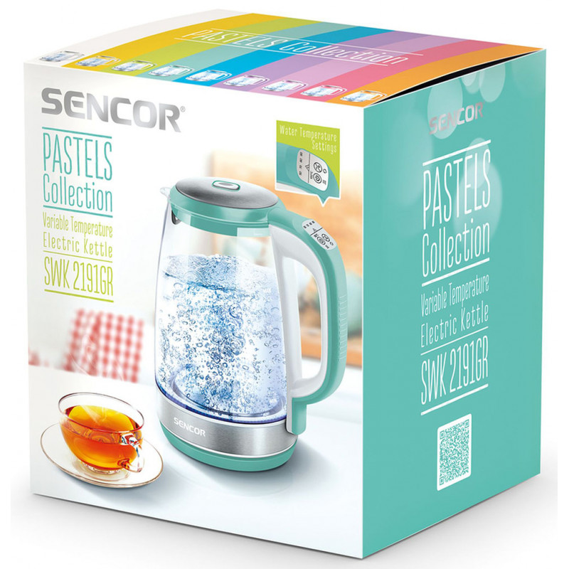 SENCOR SWK 2191GR vízforraló hőfokszabályzóval 41009152A Sencor SWK 2191GR stílusos és praktikus elektromos üveg vízforraló. A maximális kapacitása 2,0 liter és az anyagát tekintve kiváló minőségű üveg nemesacél kombináció. A vízforraló 2200 W teljesítményének köszönhetően gyorsan felmelegíti a vizet. A tökéletes ízélmény elérését az elektronikus hőmérséklet-szabályozó (50–100 °C) segíti. Az elkészült forró ital még 30 percen keresztül meleg marad, köszönhetően a hőmérsékleten tartó funkciónak. A hármas biztonsági rendszerrel felszerelt készülék.