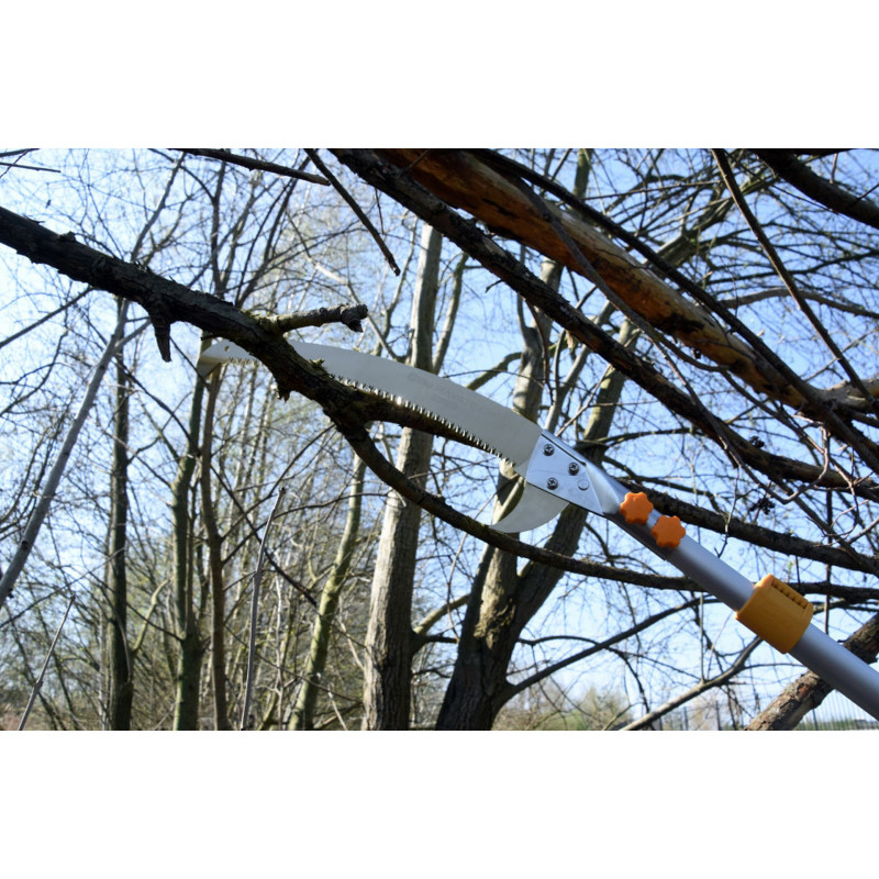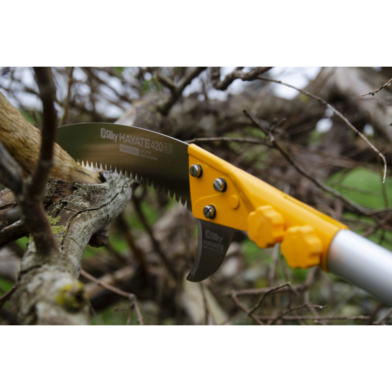 A Hayate egy igazán masszív teleszkópos fűrész, amelyet professzionális arboristák számára terveztek. Rendkívüli hossza lehetővé teszi az ágak vágását akár 6,5 méteres magasságban létra használata nélkül. A vágási sebesség egy kisebb láncfűrészével vetekszik. A penge kialakításának köszönhetően, amely főként húzás közben vág, hatékonyan és túlzott fáradás nélkül dolgozhat. Használja ki a könnyű, mégis erős alumínium szerkezet előnyeit, és hagyja, hogy a fűrész dolgozzon Ön helyett!