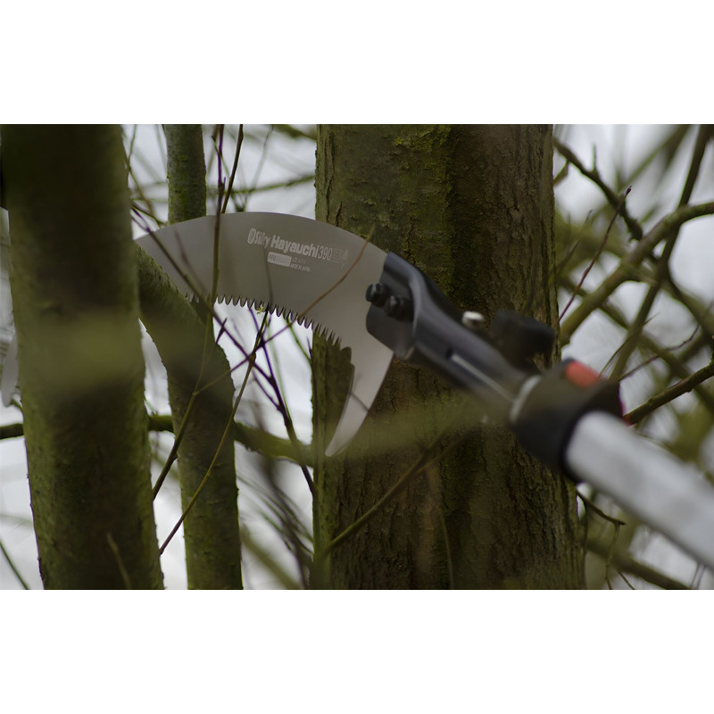 A 390 mm hosszú, ívelt penge speciális fémötvözetből készült, ennek köszönhetően nagyon tartós és erős. egyedi 4-RETSUME fogazattal van ellátva, amely nagy vágási sebességet biztosít. Ugyanakkor figyelembe kell venni, hogy ez az agresszív fogazás durvább vágási felületet hagyhat maga után.