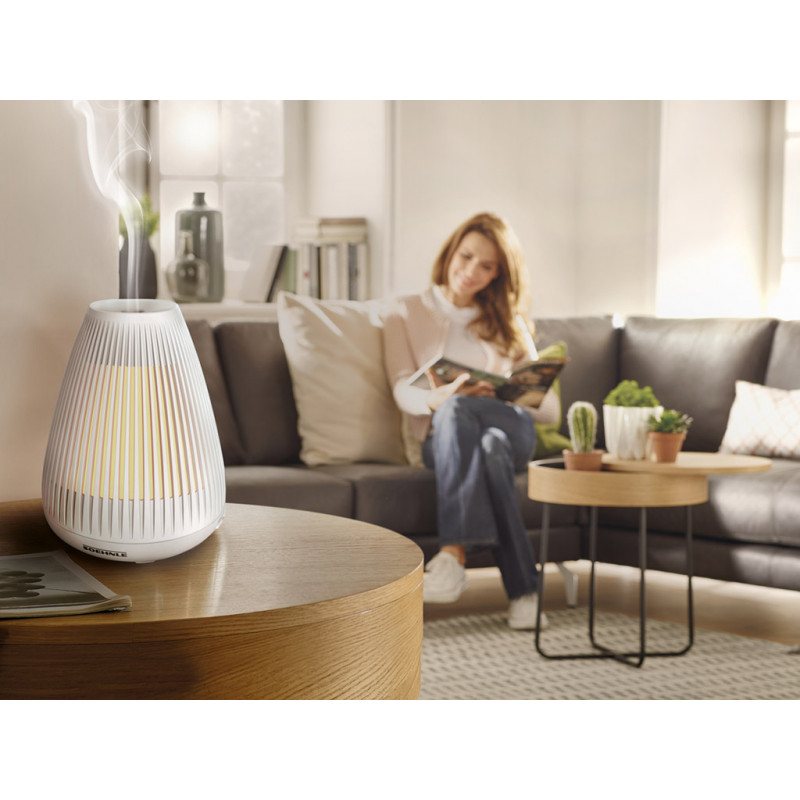 A modern megjelenésű aromadiffúzor javítja a szoba levegőjét, kellemes egyensúlyt teremt a mindennapi élethez. Nyugtató hatású LED-fénye mellett ultrahangos párásítást tesz lehetővé, optimalizálva a szoba páratartalmát, így pozitív hatású az egészségre. Ultrahangos porlasztás az optimális illat elosztás érdekében. Fehér LED/pulzáló vagy állandó fényhatás. Az illat kibocsátás intervalluma választható: állandó vagy 10 másodpercenként. Automatikus kikapcsolás az üres víztartály esetében.