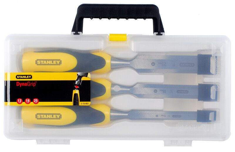 A STANLEY 2-16-883 egy háromrészes faipari vésőkészlet, amely 12 mm, 18 mm és 25 mm szélességű vésőket tartalmaz. A pengék kovácsolt, magas króm-karbon acélból készülnek, így kiváló éltartással és tartóssággal rendelkeznek. A vésők előélezettek, így azonnal használatra készek. A Dynagrip markolat ergonomikus, puha tapintású és csúszásmentes, acél ütőfejjel ellátva a kalapáccsal való használathoz.
