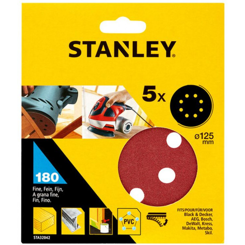 A STANLEY STA32042-XJ egy 5 darabos csiszolópapír-készlet, O 125 mm átmérőjű korongokat tartalmaz P180 szemcsemérettel. A korongok alumínium-oxid szemcsékkel vannak bevonva a gyors anyagleadás érdekében. A tépőzáras („hook & loop”) rögzítés megkönnyíti a lapcserét, míg az előfuratolt konstrukció kompatibilis porszívós porleválasztó rendszerekkel. Ideális fa-, fém- és festett felületek finom csiszolására vagy előkészítésére.