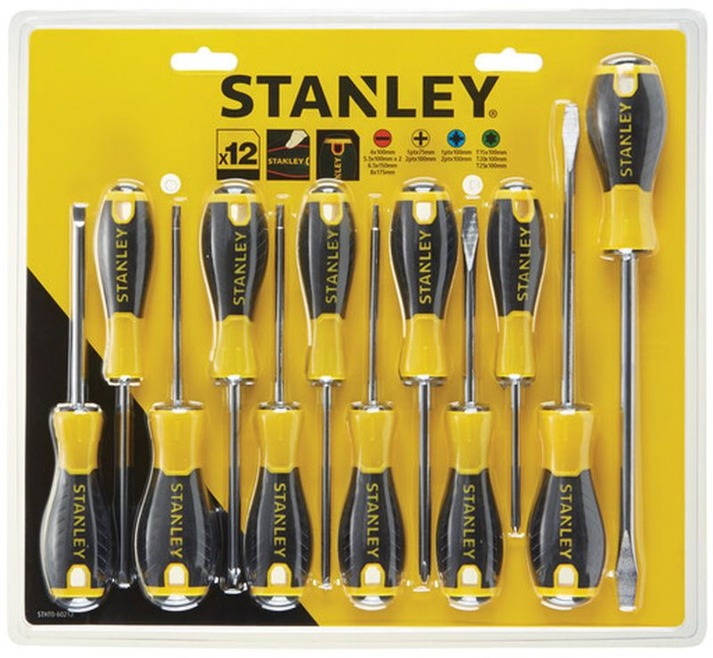 A Stanley STHT0-60212 egy 12 részes „Essential” csavarhúzó-készlet, amelyet mindennapi használatra terveztek. A készlet króm-vanádium acélból készült szárakkal és puha, textúrázott markolatokkal rendelkezik, melyek kényelmes fogást és biztonságos használatot biztosítanak. A változatos hegykialakítás – lapos, Phillips, Pozidriv és Torx – sokféle csavarozási feladathoz alkalmassá teszi.